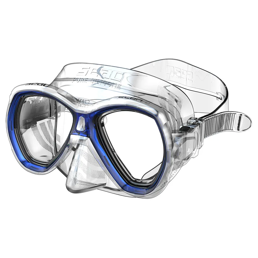 L’ensemble comprend un masque en silicone transparent Elba MD et un tuba Miniflash avec bouchon anti-Ă©claboussures ou Tribe avec valve.