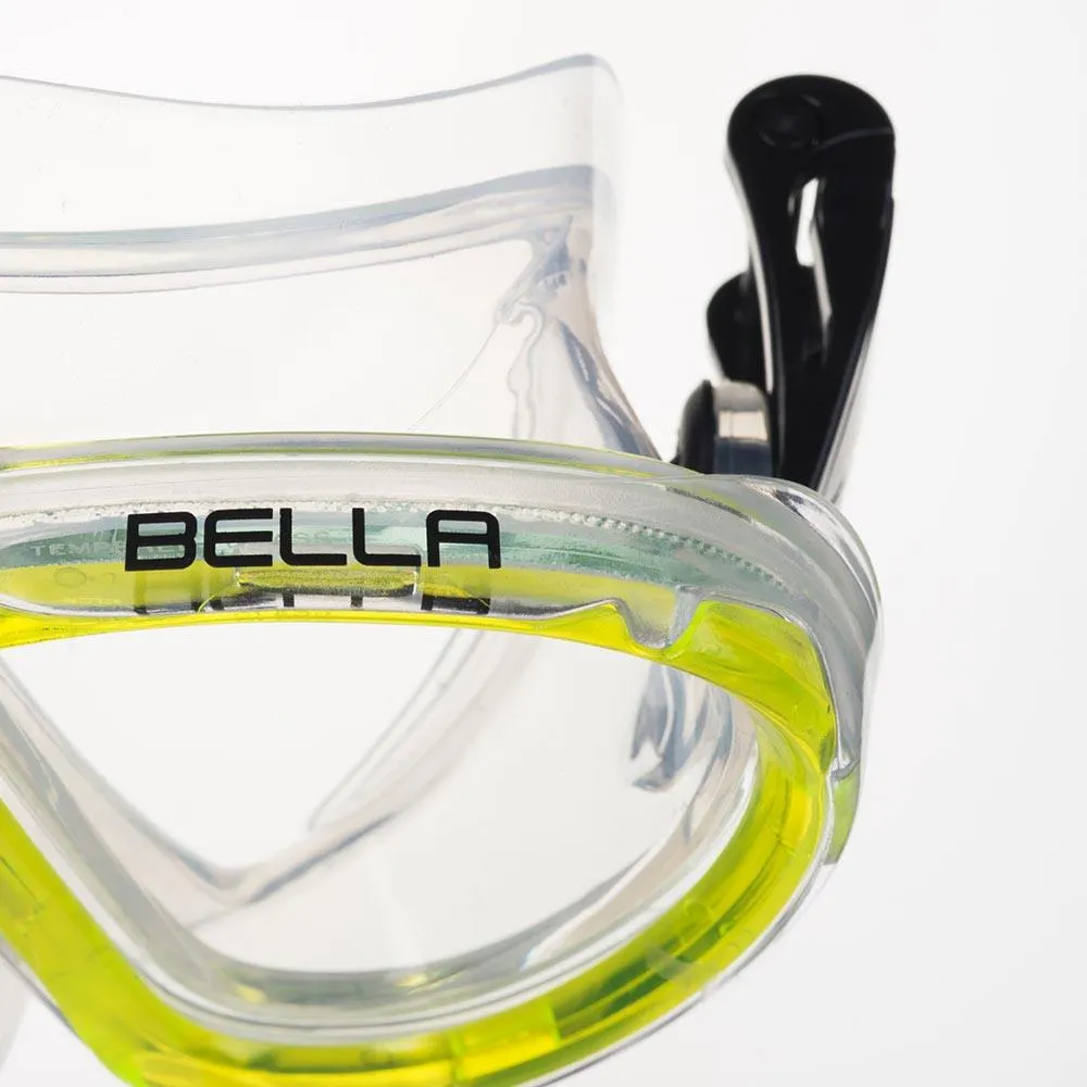 Bella, masque à deux vitres en verre trempé, avec jupe en silicone transparente hypoallergénique. Convient aux enfants et aux adultes ayant un visage plus étroit.