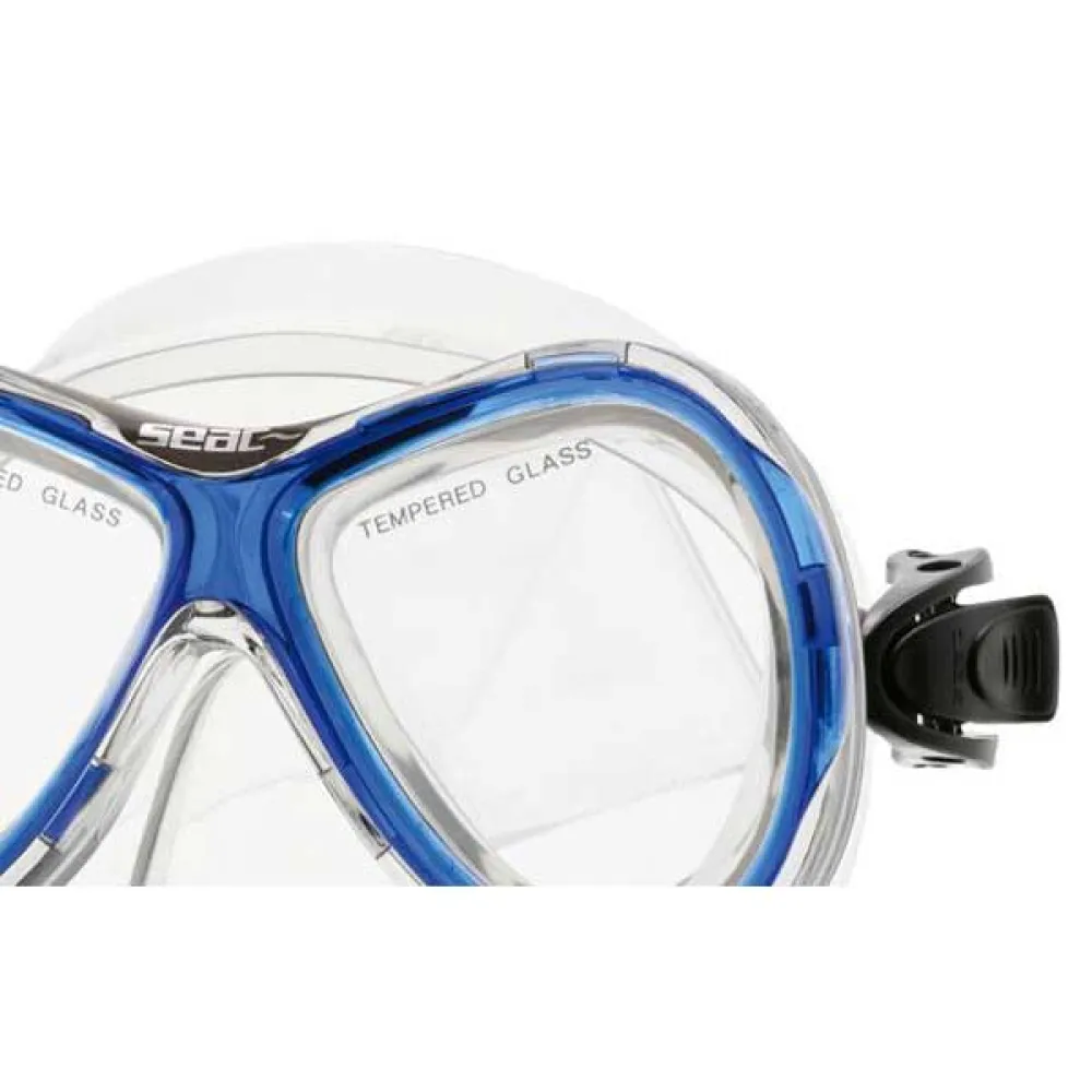 Masque binoculaire avec verre trempé, disponible avec la jupe en silicone hypoallergénique ou en Siltra sans phatlates. Adapté pour les enfants. Adapté aux visages minces.