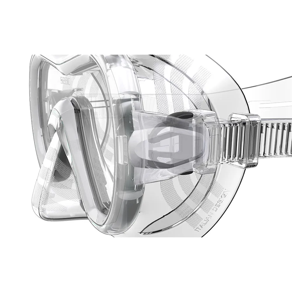 Giglio, masque monovitre en verre trempé, disponible avec jupe en silicone noire et transparente hypoallergénique de grande qualité. Cerclage polycarbonate. Boucle à double bouton sur la jupe pour le rendre encore plus facile à ajuster.