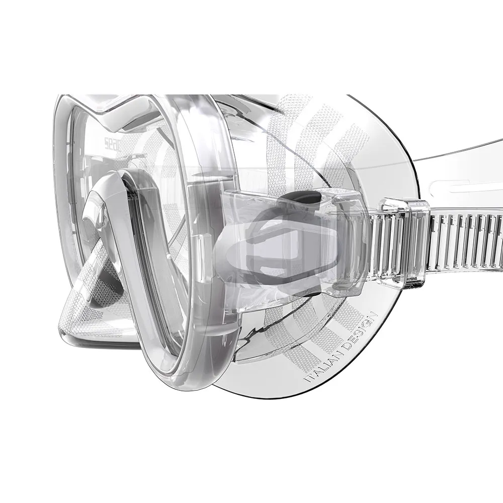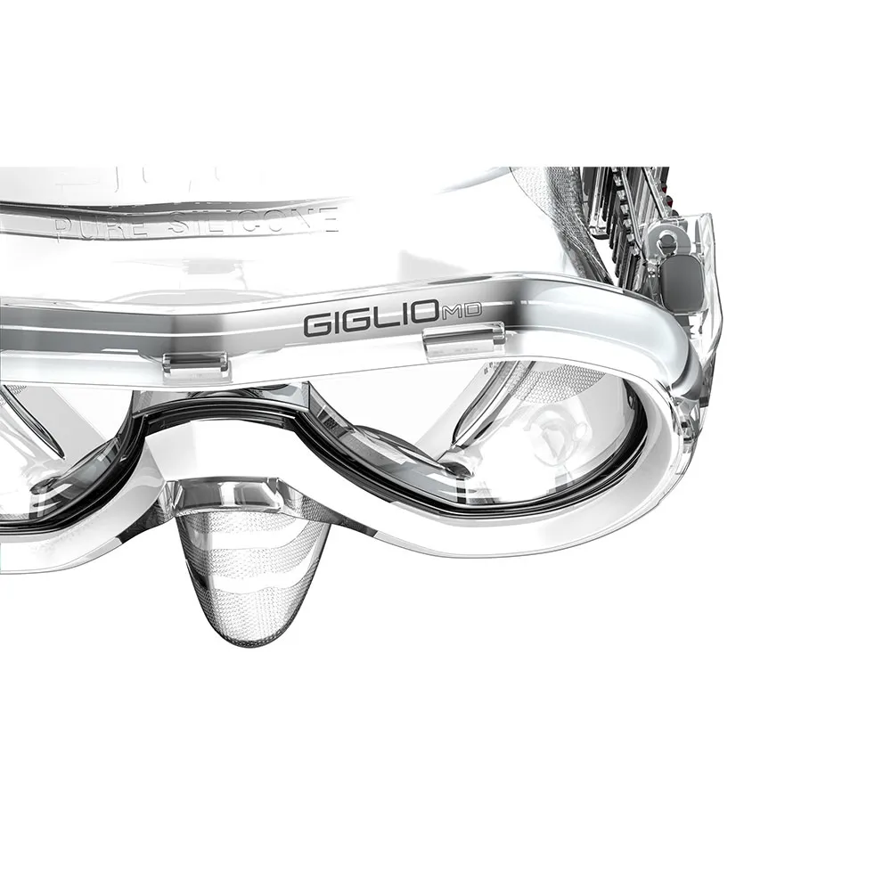 Giglio Md, masque monovitre en verre trempé avec jupe en silicone transparente et noire, conçu pour un meilleur ajustement sur les visages plus étroits et les enfants. Boucle à double bouton pour une bonne facilité dajustement.